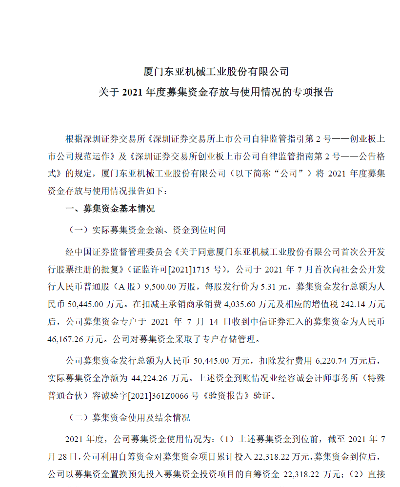 關(guān)于2021年度募集資金存放與使用情況的專項報告