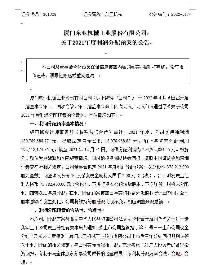 關(guān)于2021年度利潤分配預案的公告