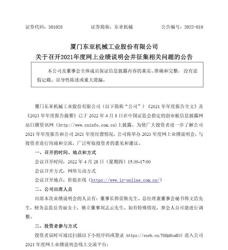關(guān)于召開2021年度網(wǎng)上業(yè)績說明會并征集相關(guān)問題的公告